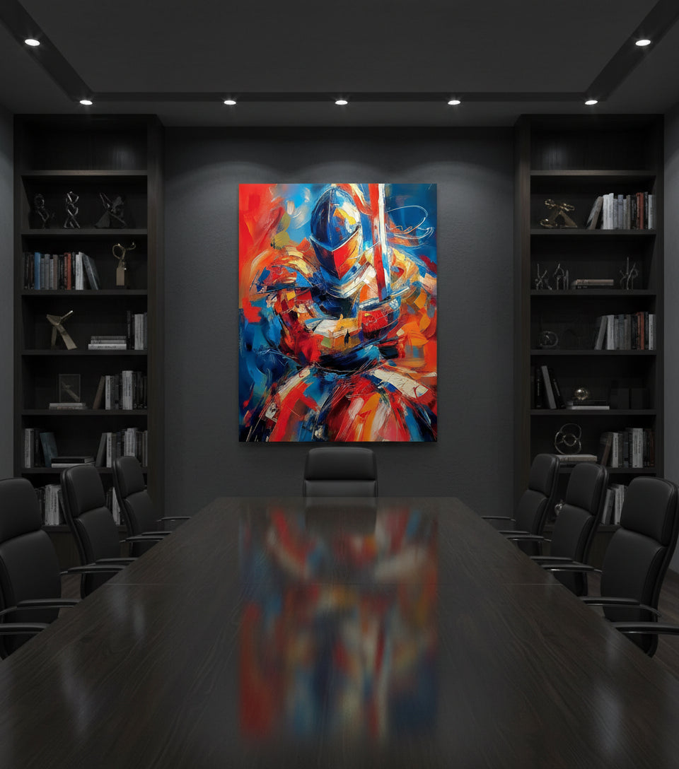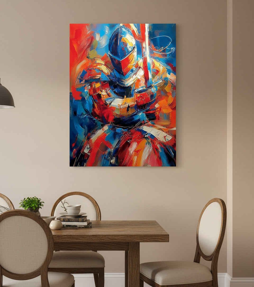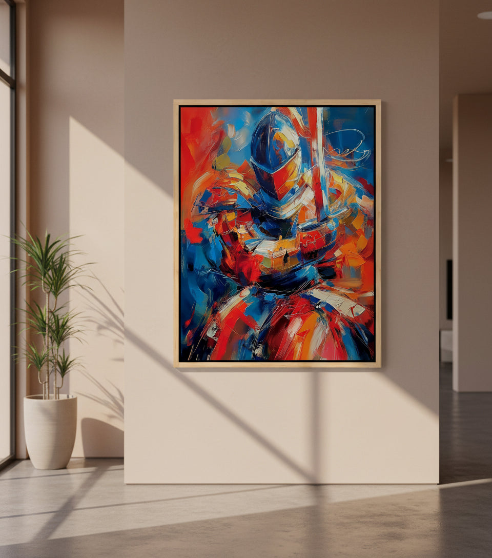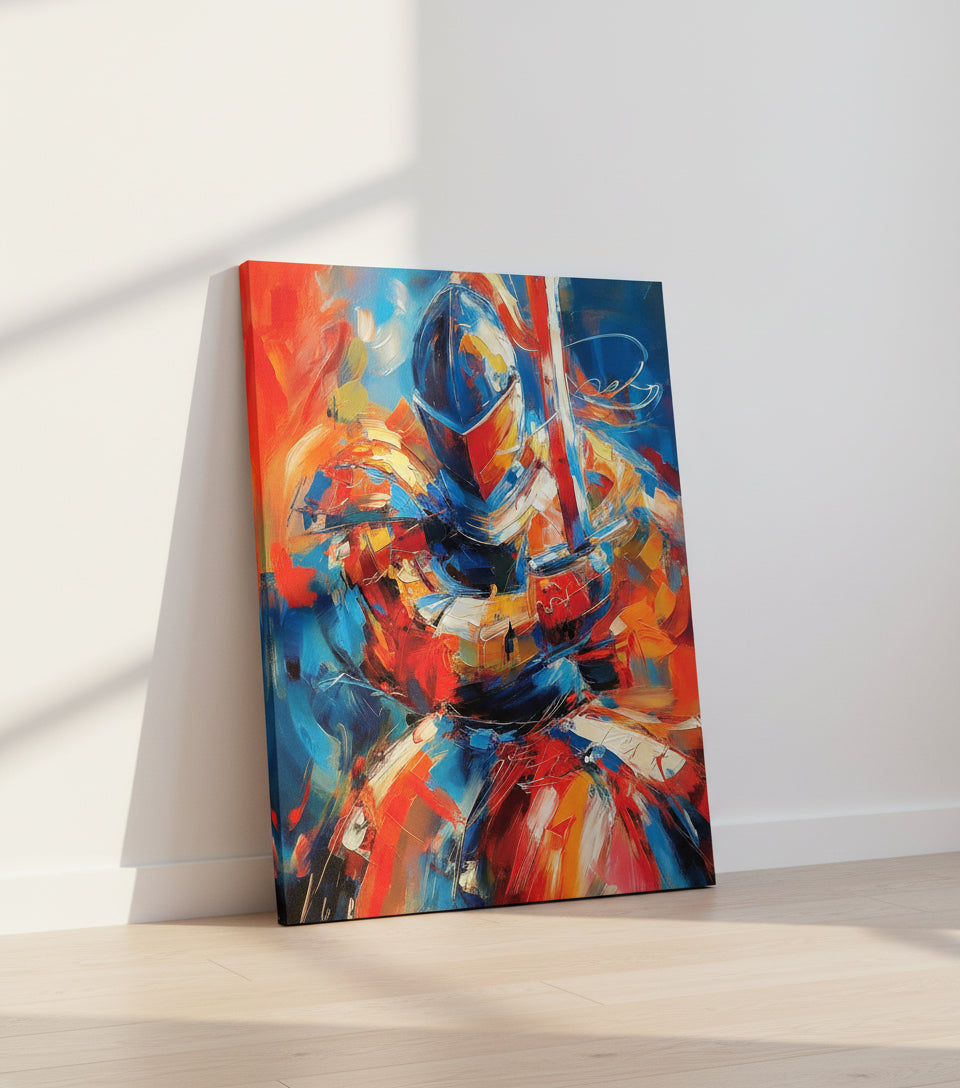 This powerful Christian Warrior Canvas portrays a knight in vibrant armor, bowing his head in prayer and preparing his heart before the battle. Surrounded by fiery reds and heavenly blues, the artwork symbolizes divine protection, courage, and the spiritual strength that comes only from God.