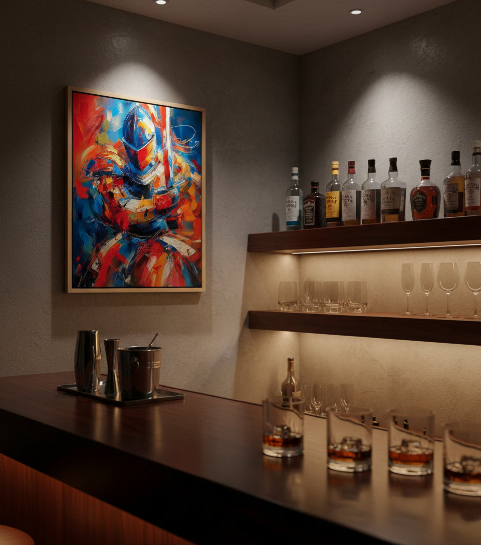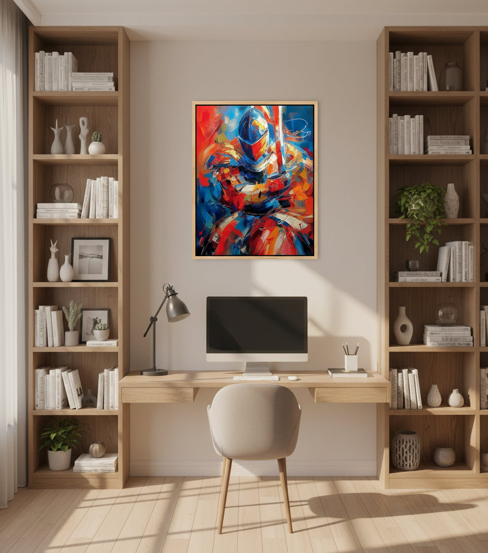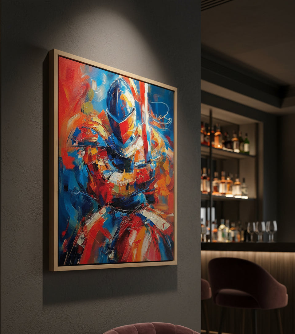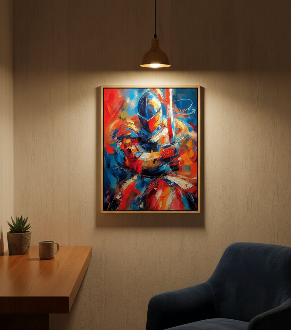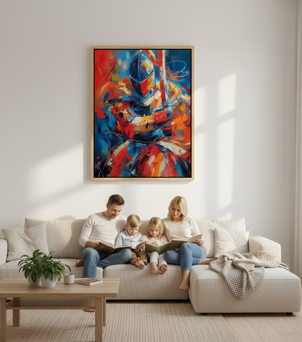 This powerful Christian Warrior Canvas portrays a knight in vibrant armor, bowing his head in prayer and preparing his heart before the battle. Surrounded by fiery reds and heavenly blues, the artwork symbolizes divine protection, courage, and the spiritual strength that comes only from God.