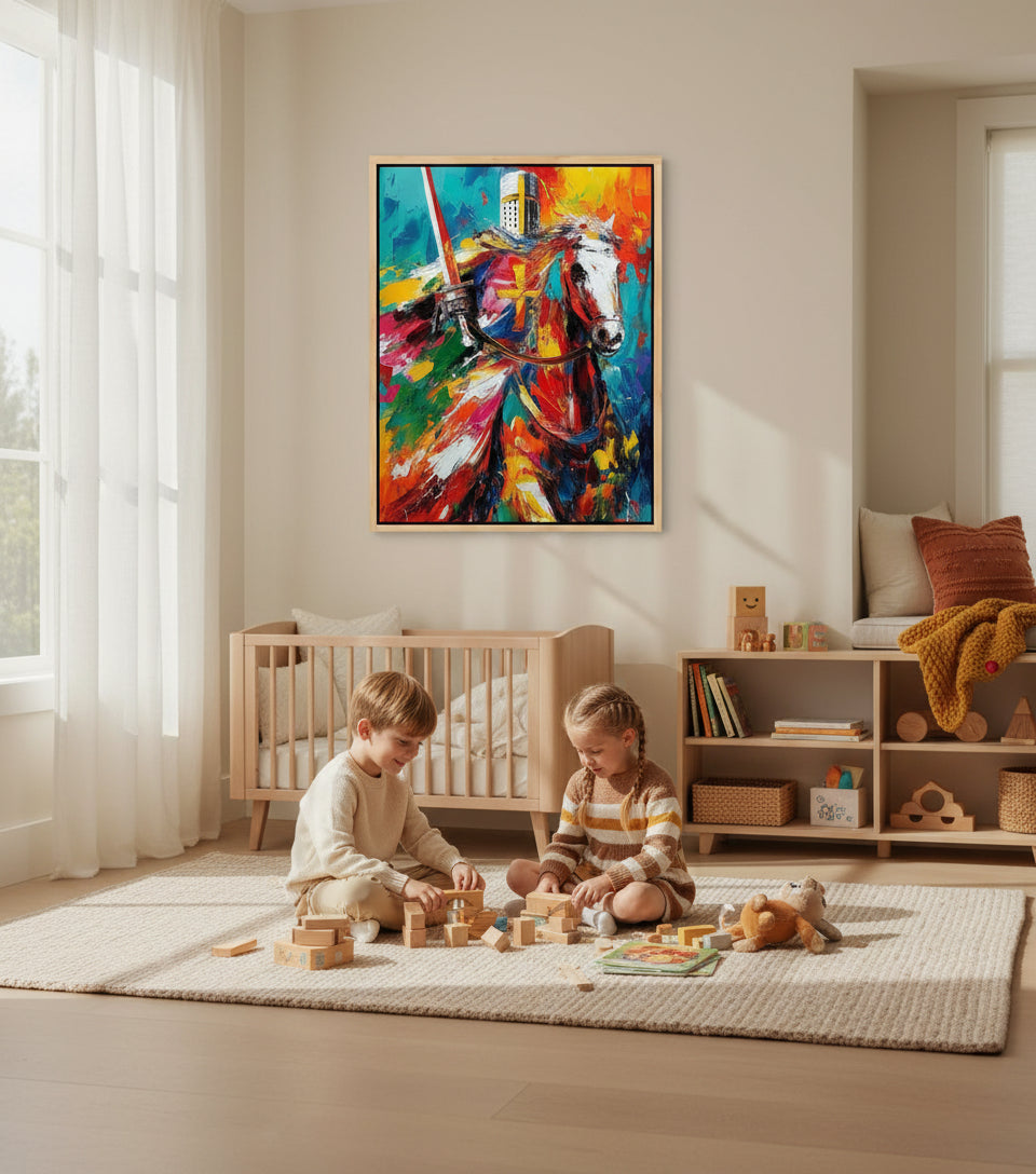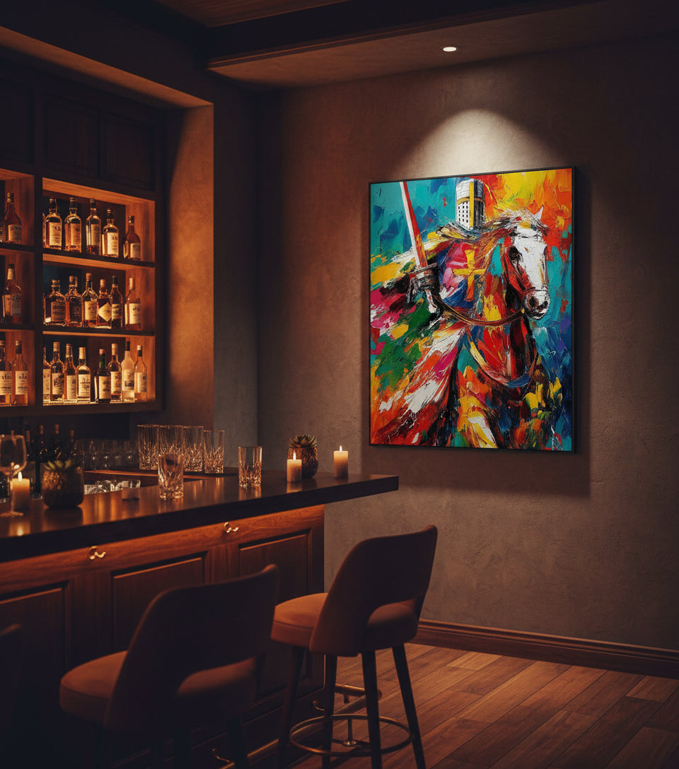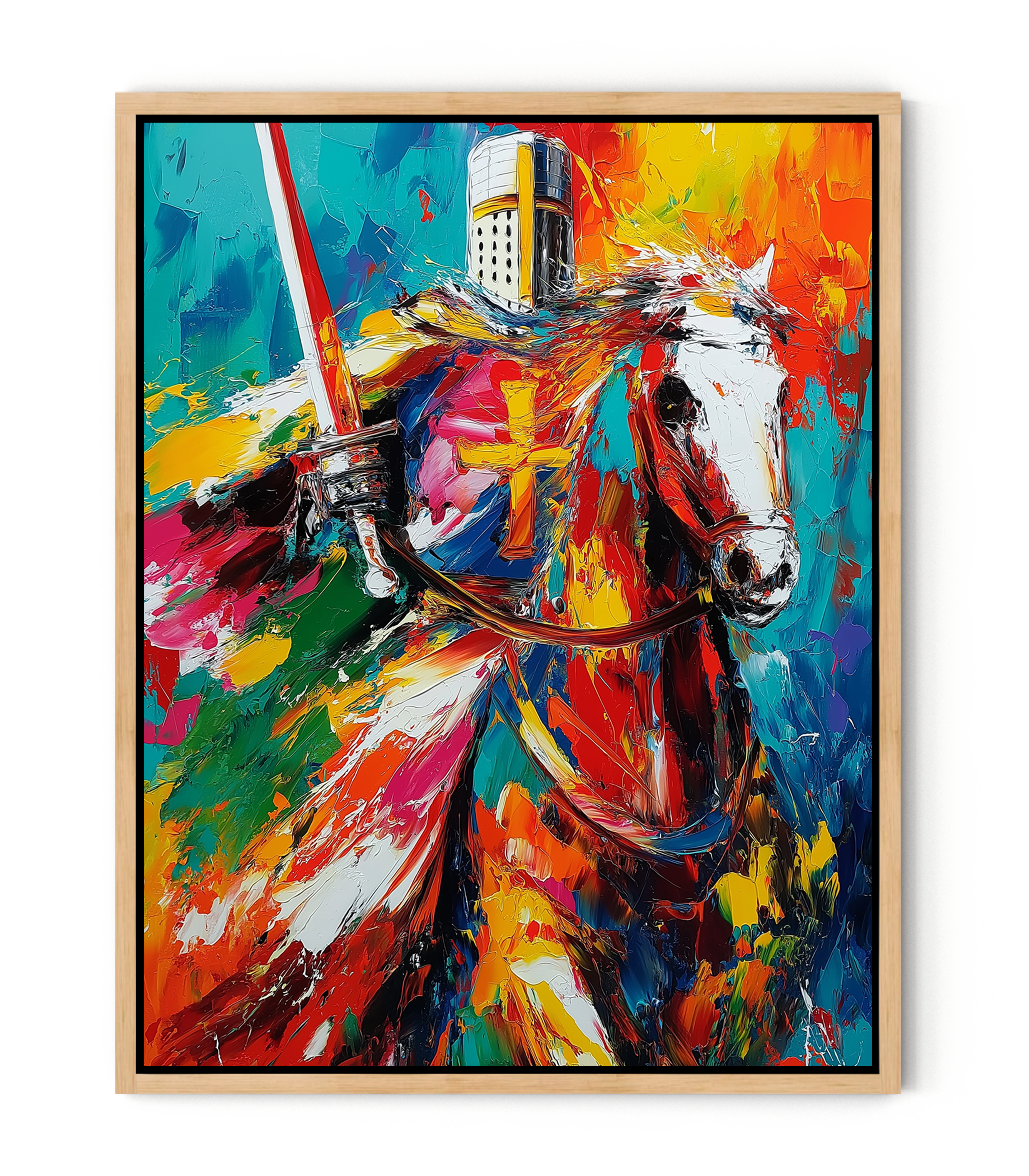 This vibrant and powerful canvas portrays a Christian knight riding a white horse, charging forward with unshakable courage and divine purpose.