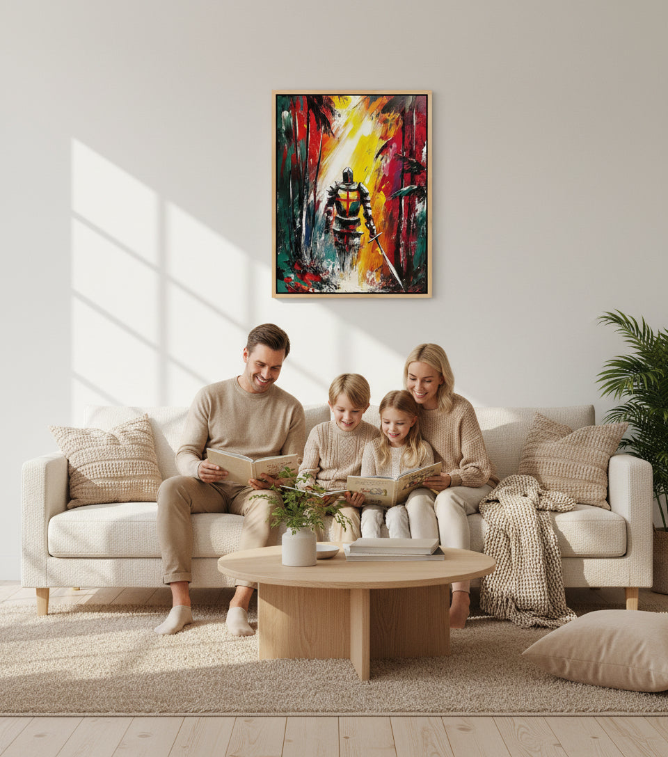 Christian Warrior in the Forest Canvas – Spiritual Battle Wall Art, Armor of God Painting, Light vs Darkness Artwork