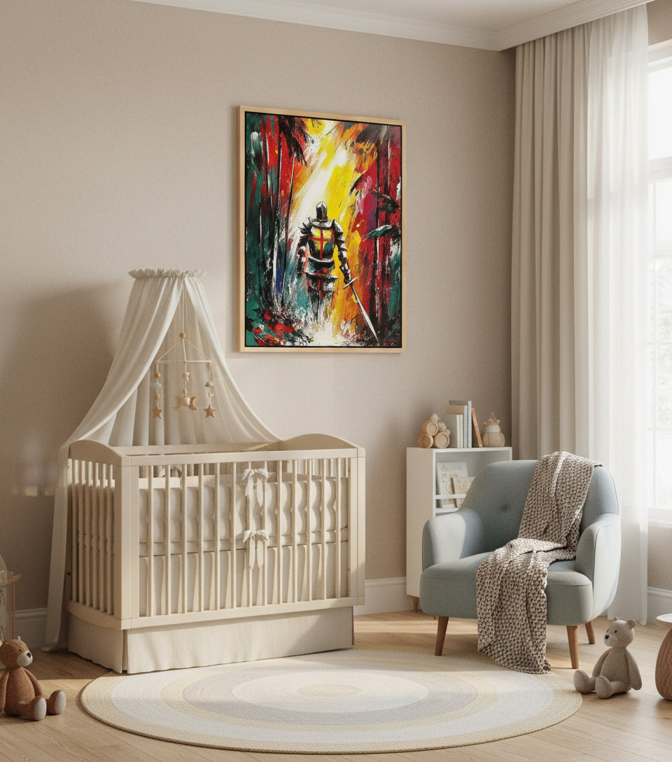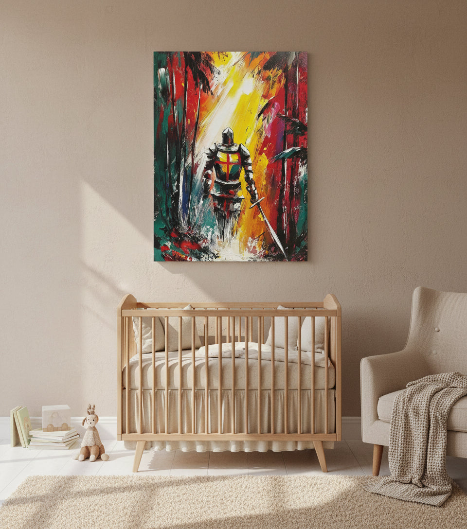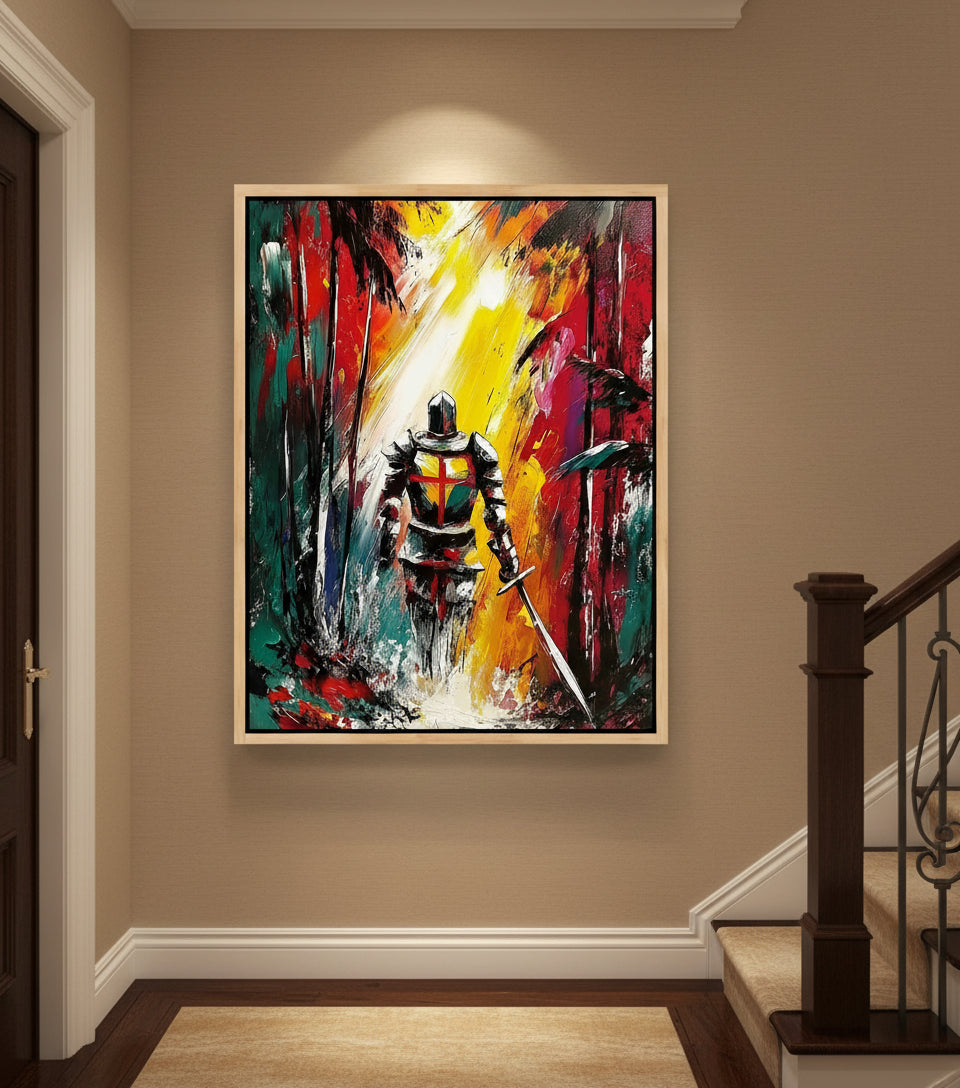 This powerful Christian Warrior Canvas depicts a lone knight bearing a cross upon his back, walking through a dark and chaotic forest toward a radiant beam of heavenly light.