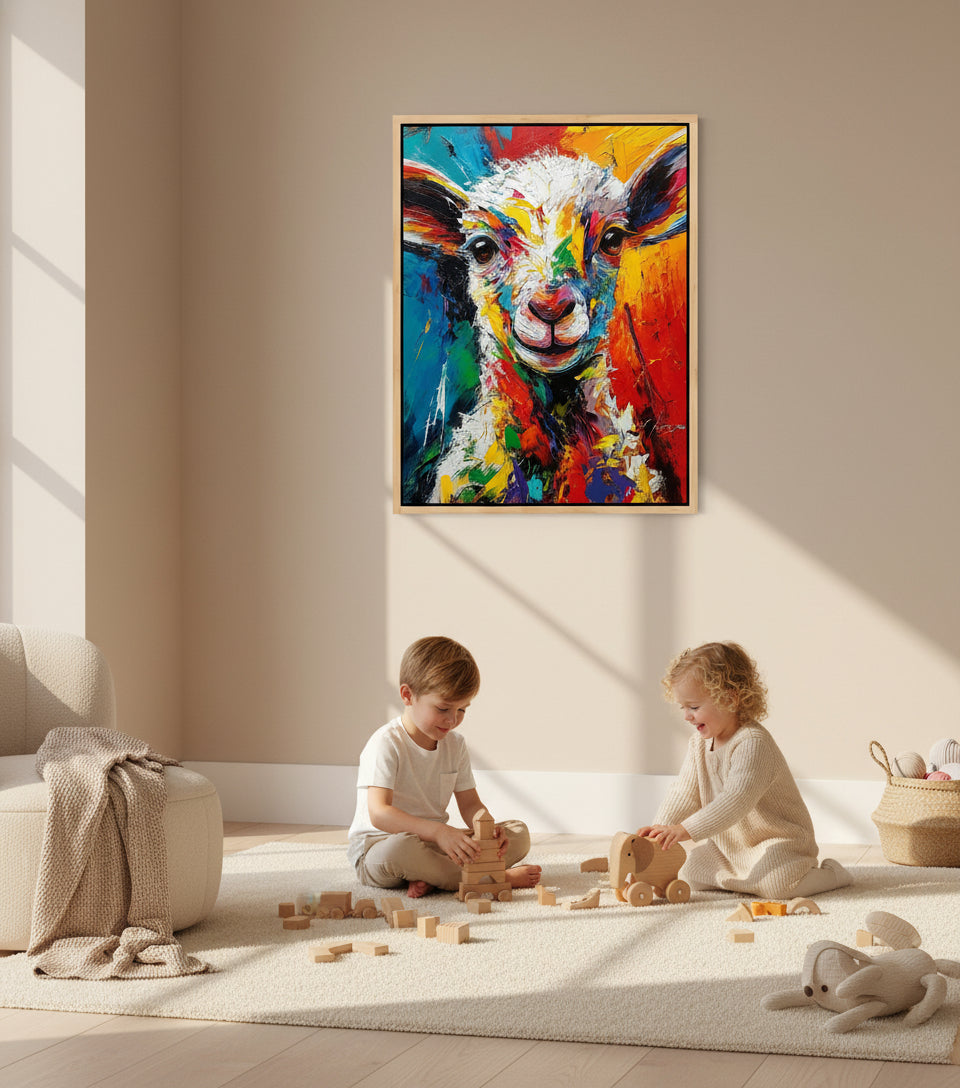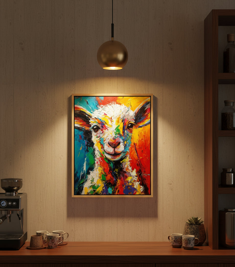 This vibrant abstract painting features a joyful lamb in bold strokes of red, blue, yellow, green, and orange.