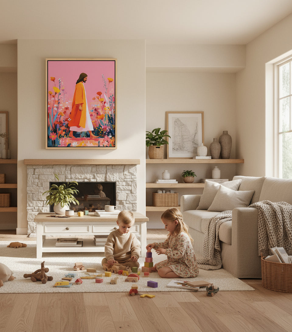 This minimalist, cartoon-style painting portrays Jesus walking along a path lined with blossoms.