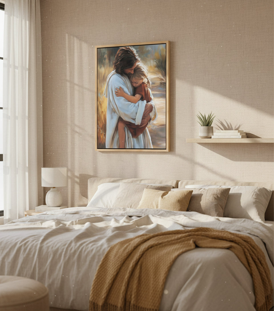This heartwarming painting captures a tender moment of Jesus holding a little girl close to His chest, offering comfort, safety, and unconditional love.