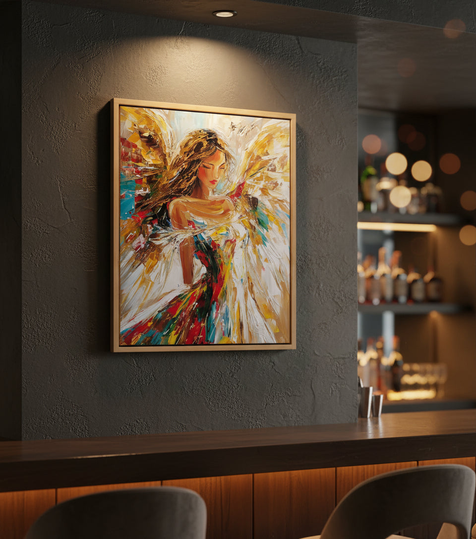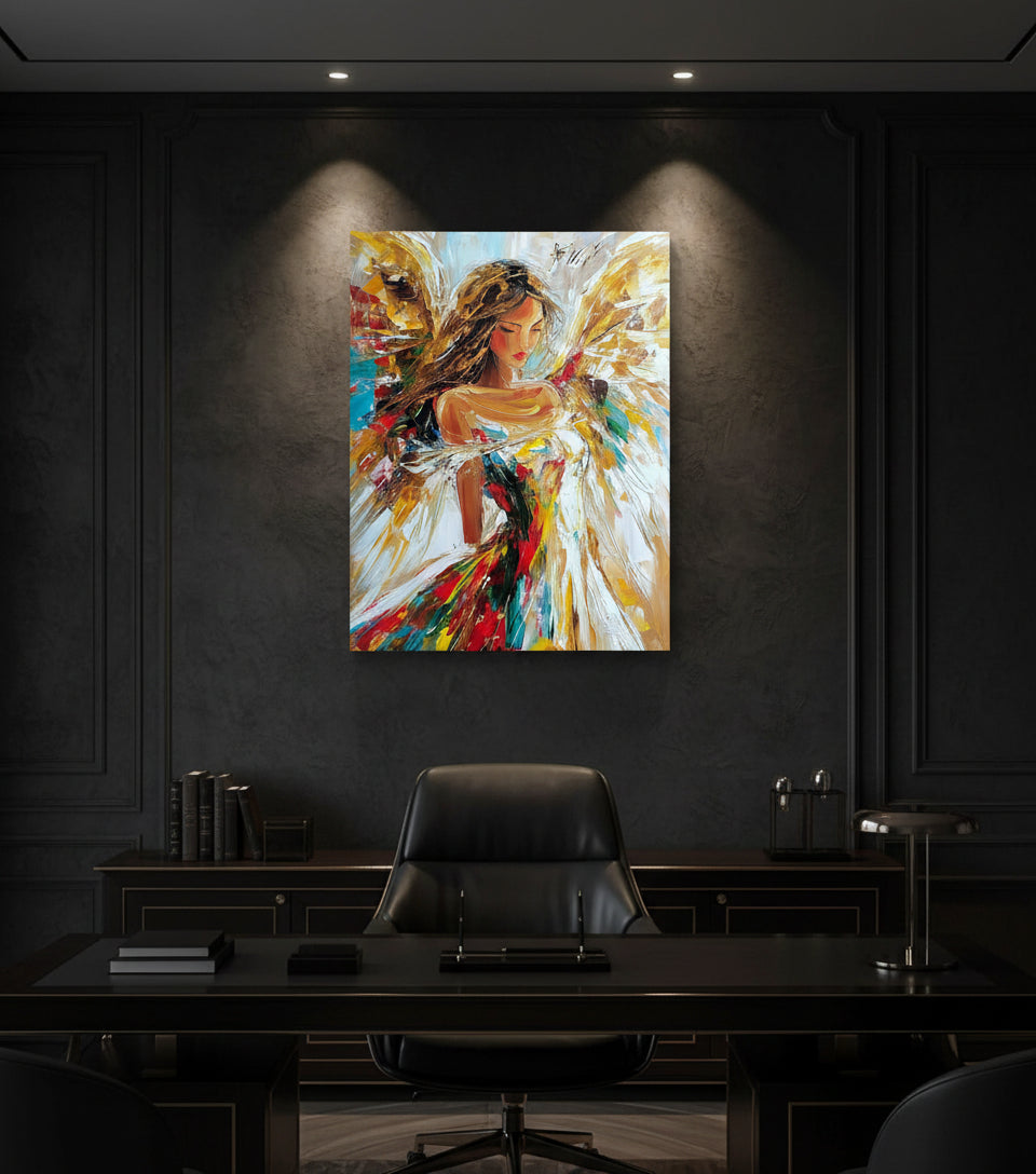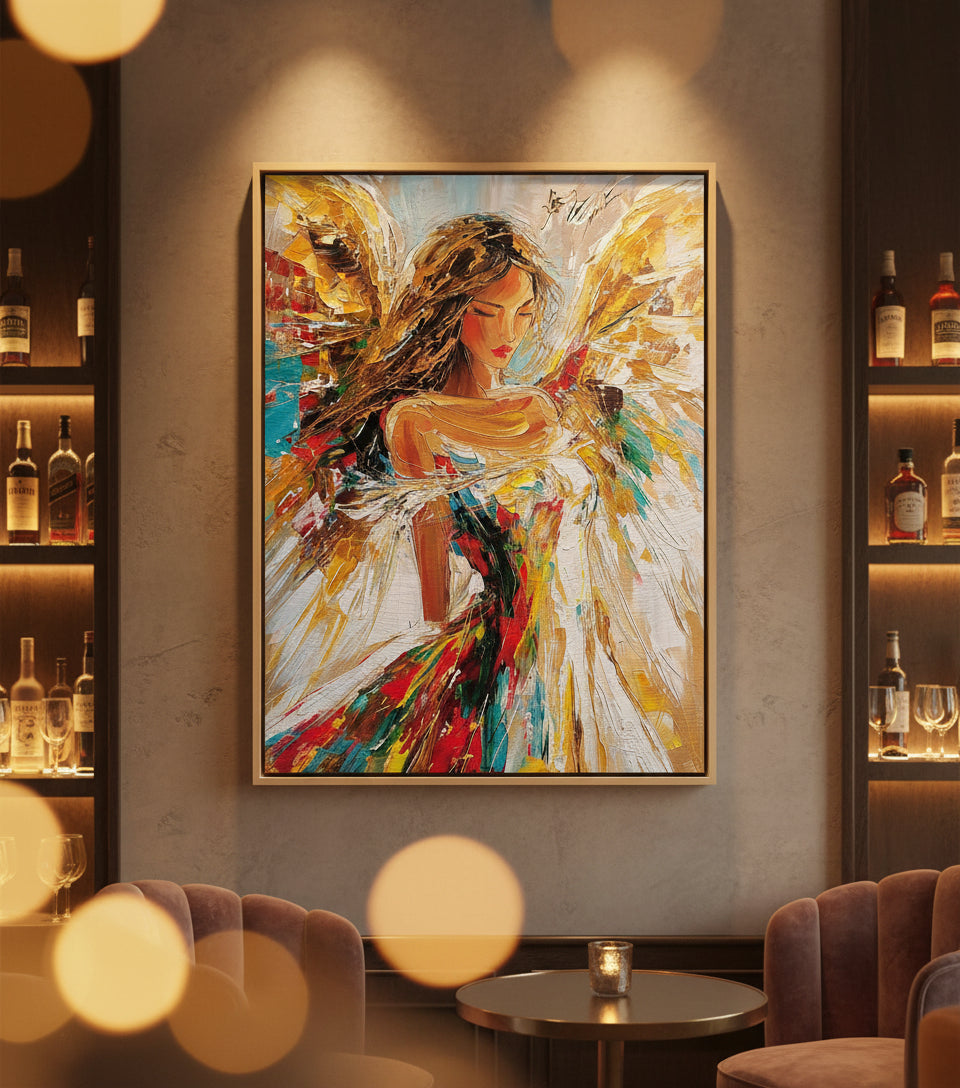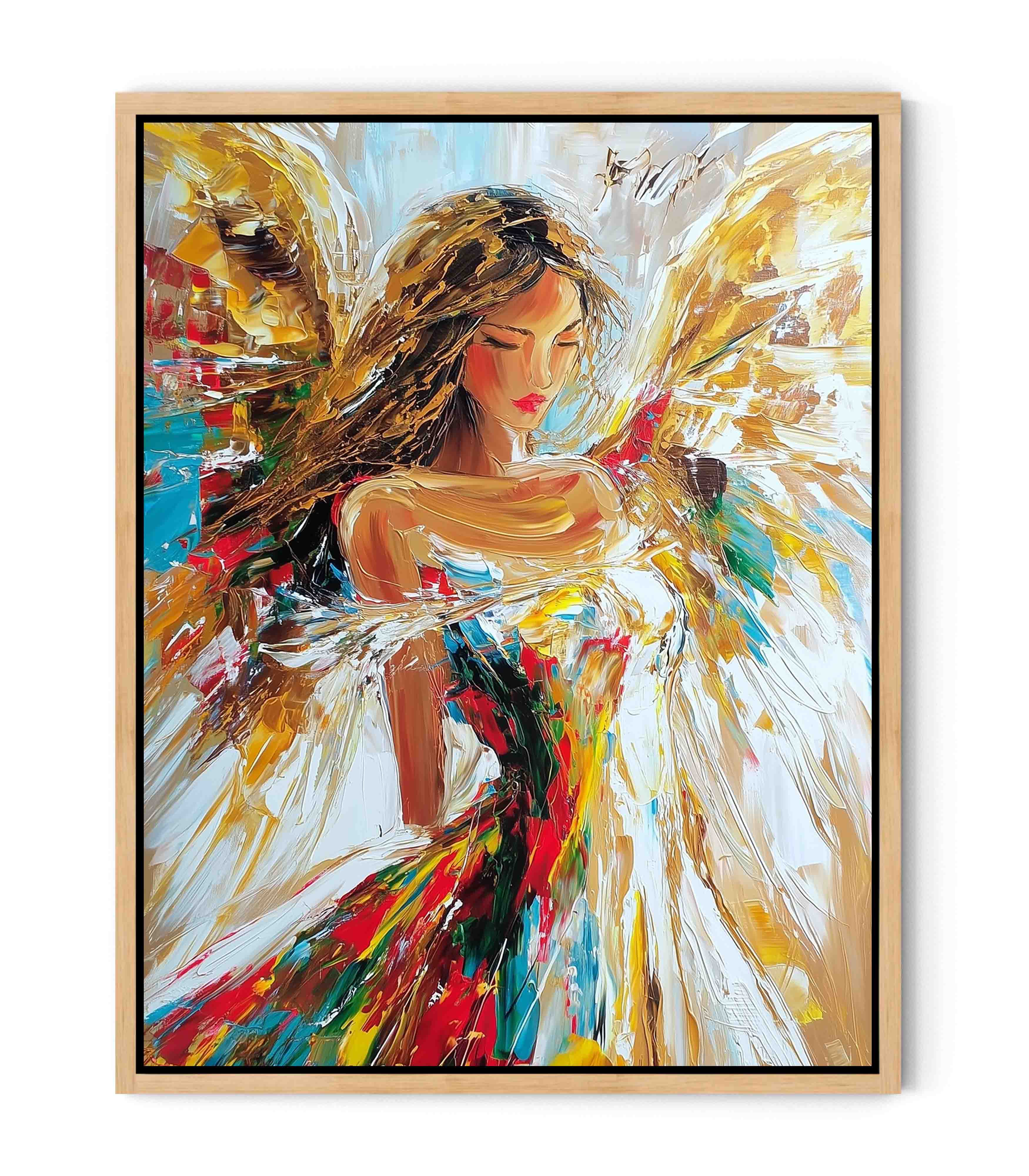 This elegant “She Is Angel” canvas captures a peaceful angel surrounded by radiant colors and flowing golden wings.