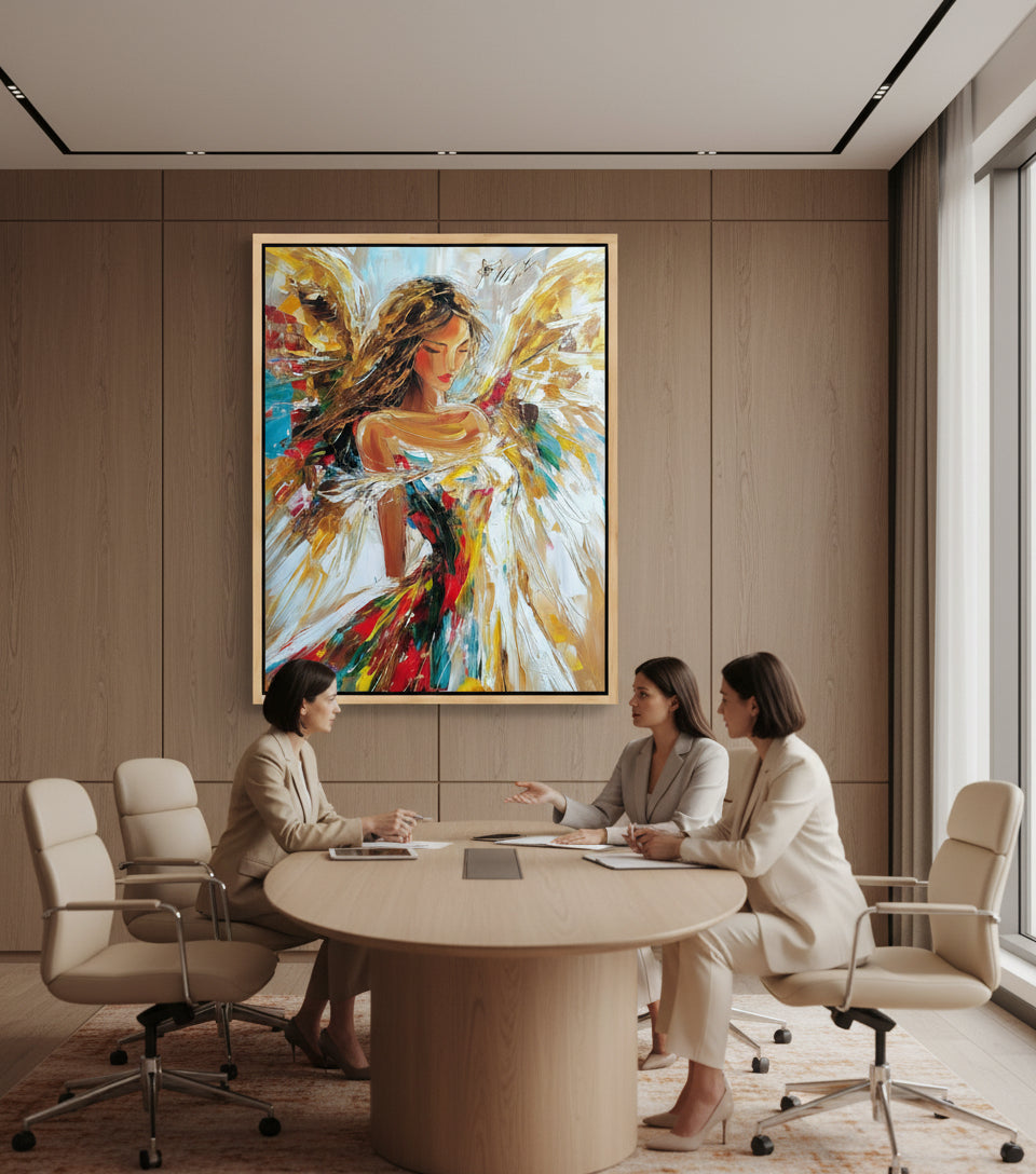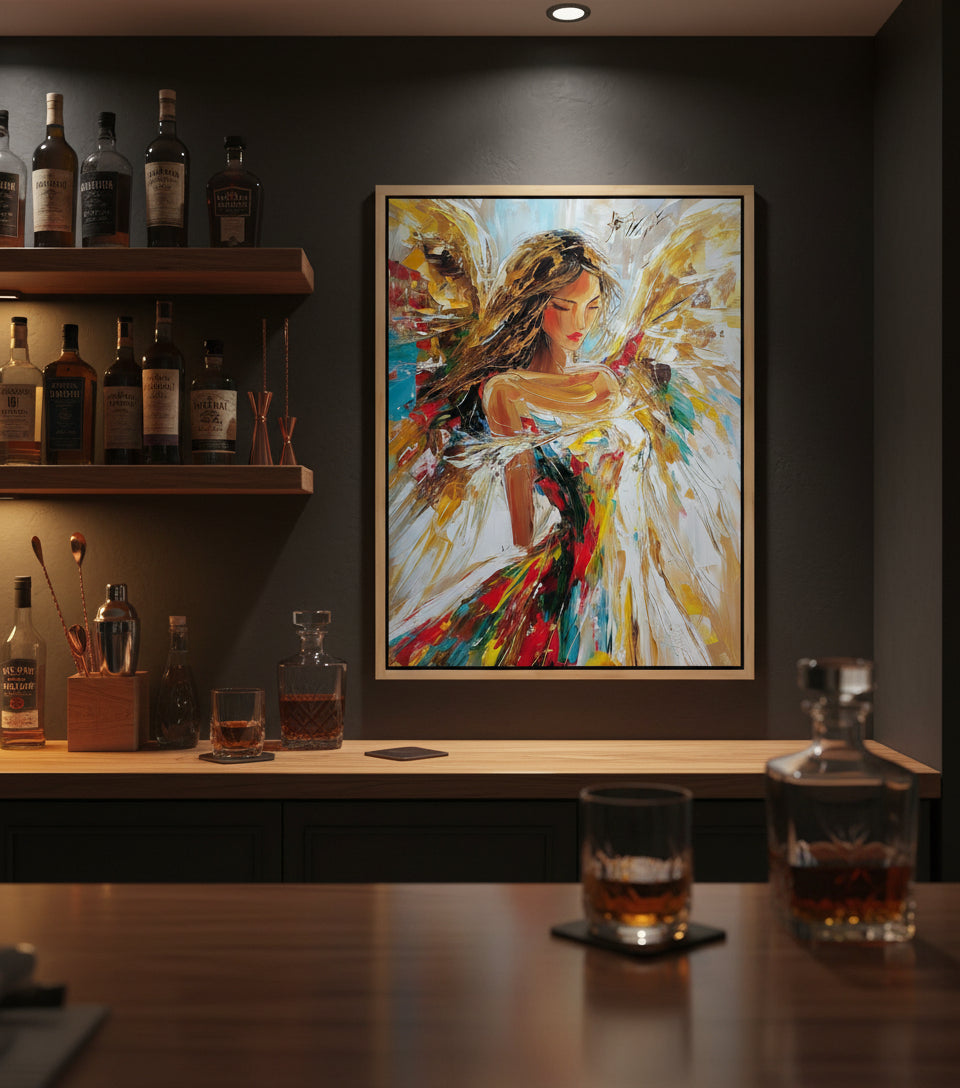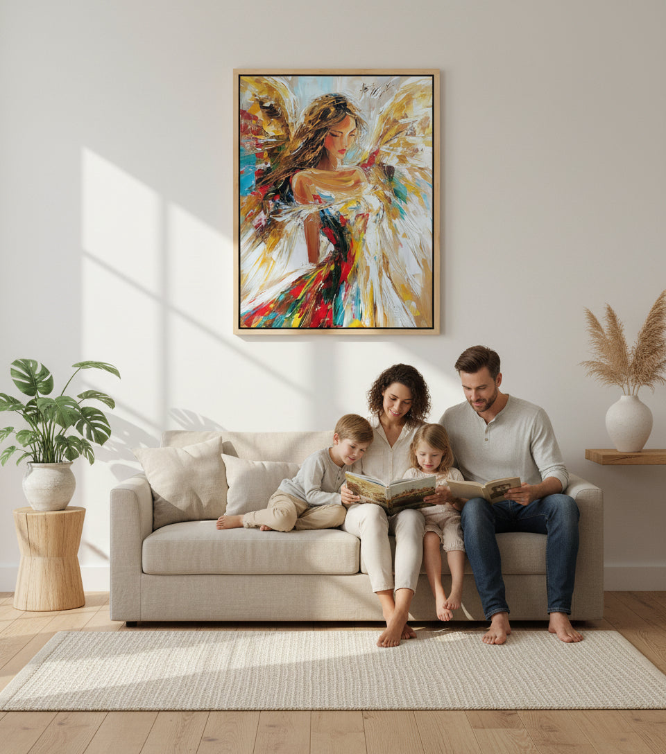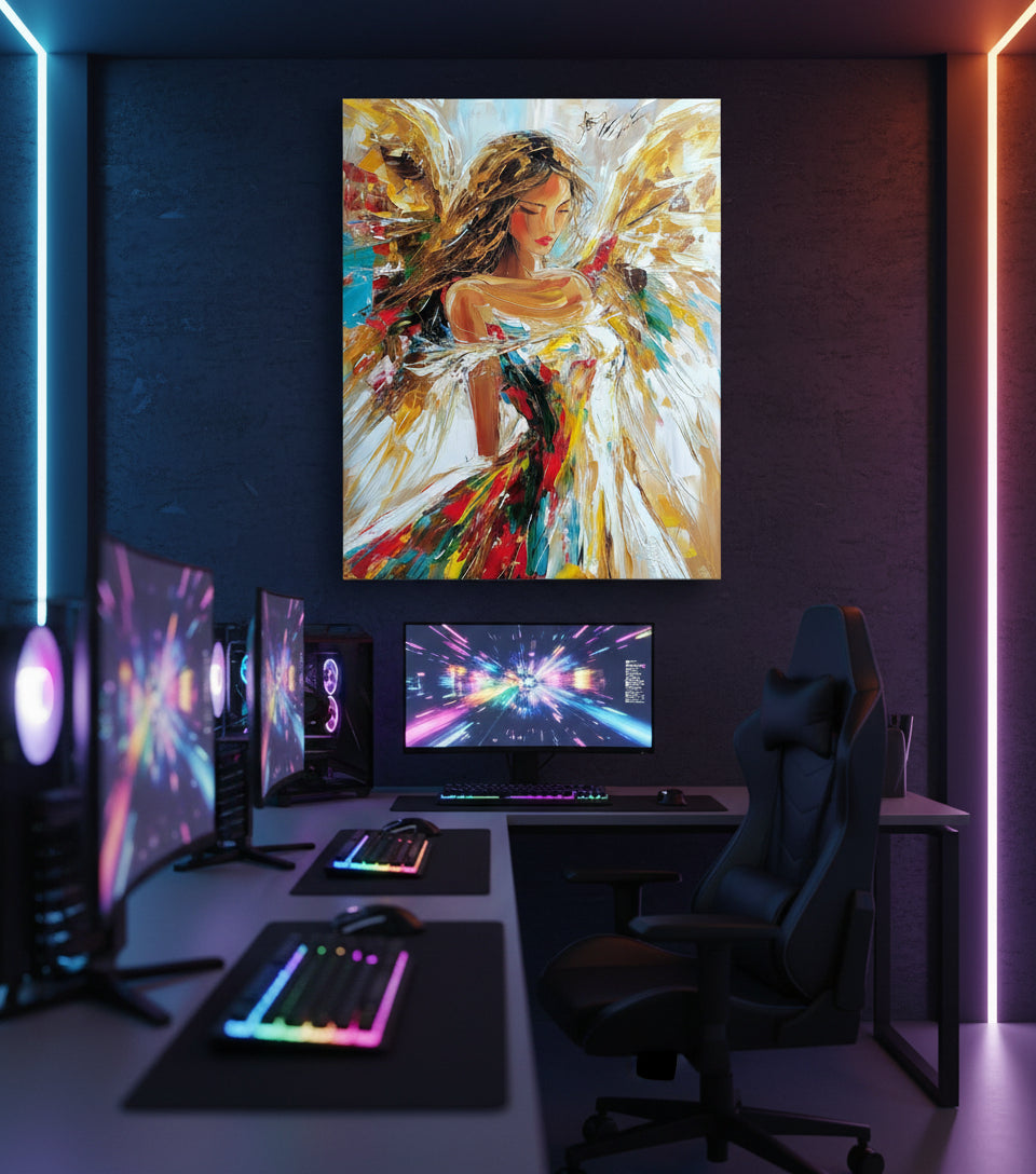 This elegant “She Is Angel” canvas captures a peaceful angel surrounded by radiant colors and flowing golden wings.
