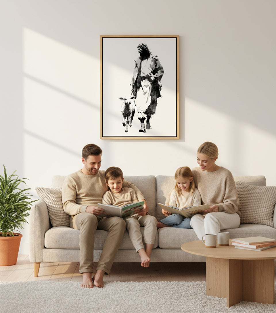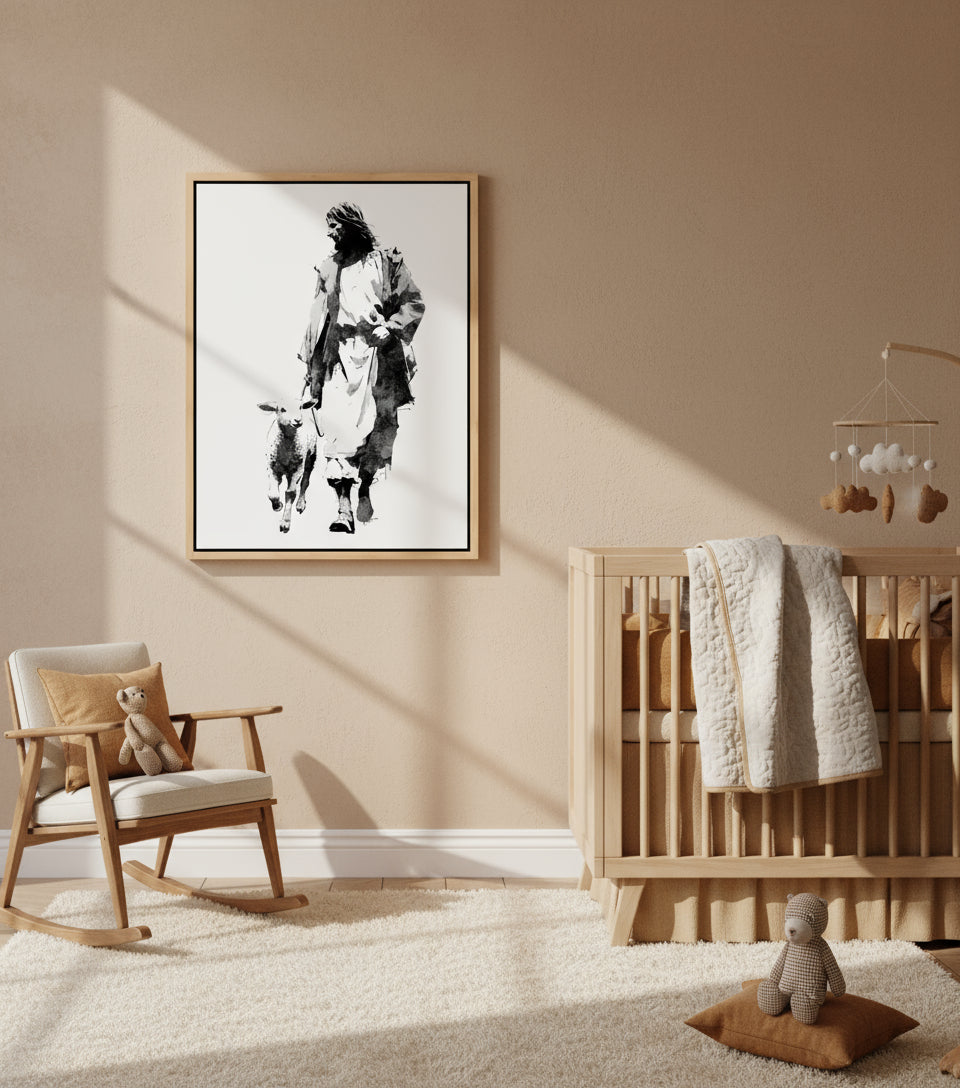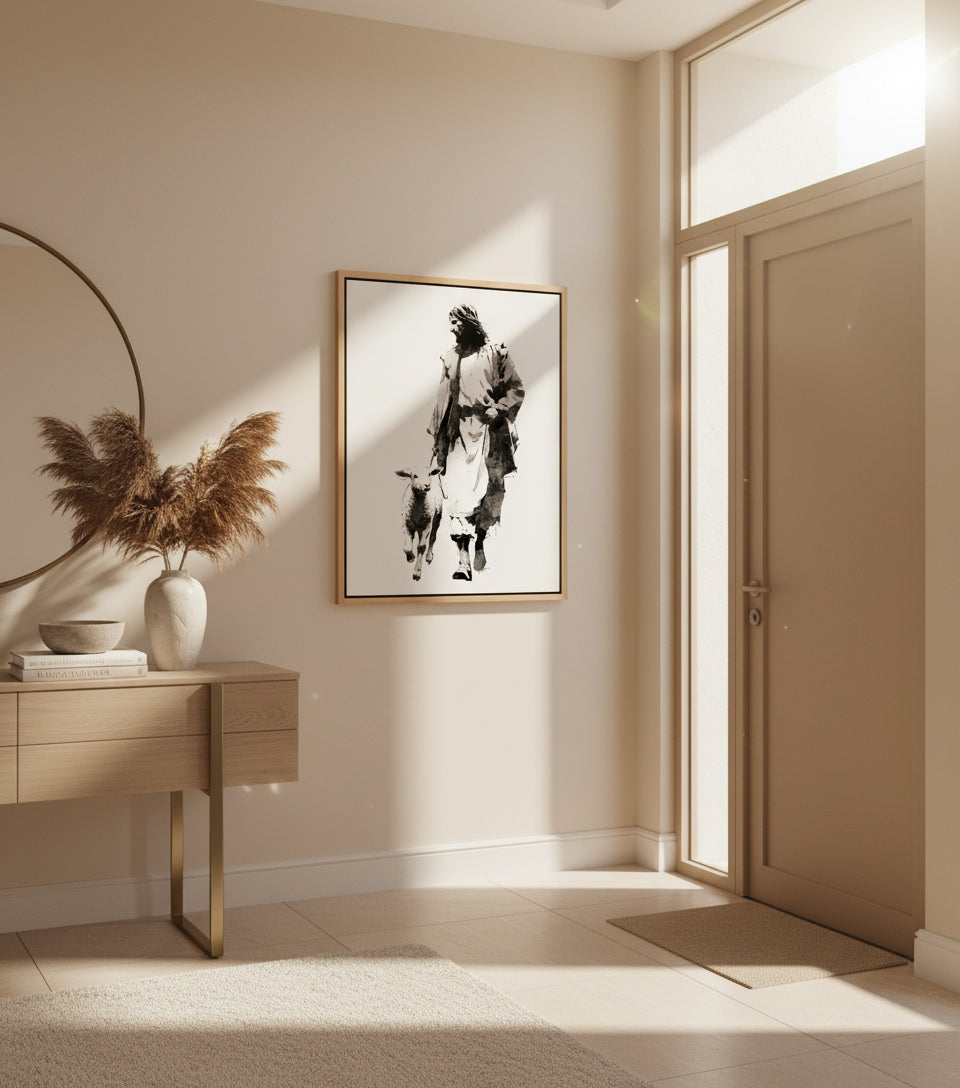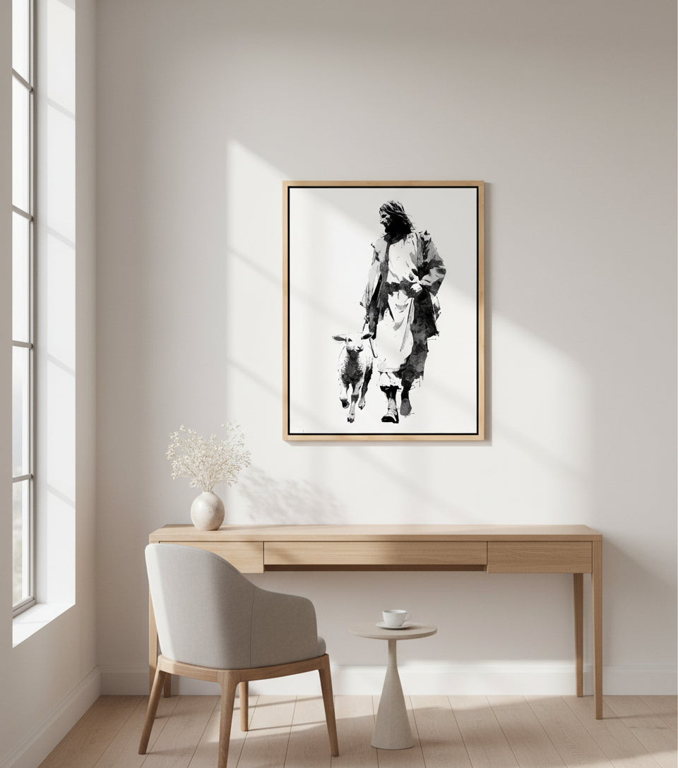Inspired by the monochrome energy of Japanese manga and the expressive brushwork of Yoji Shinkawa, this artwork portrays Jesus in a flowing white robe, walking steadily forward with a gentle lamb at His side.